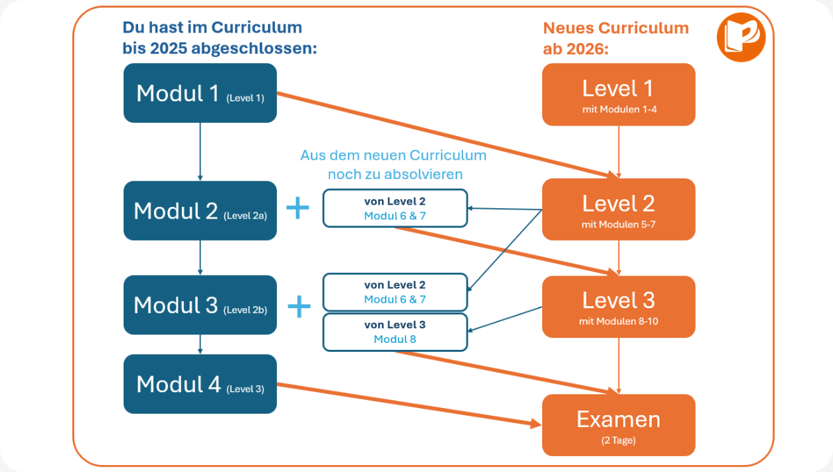 - Neu: 3 Level mit insgesamt 10 Modulen absolvieren.