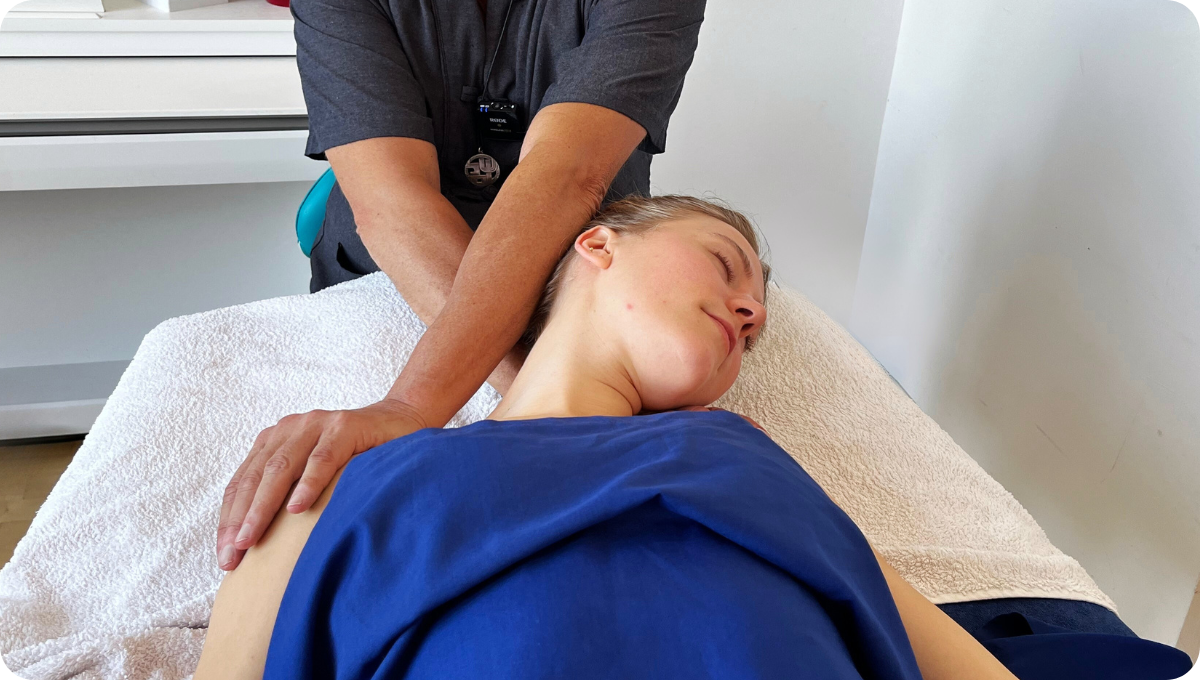 - Komplexe Nackenbehandlung in Rückenlage: Umfasst Tender-Points, Akupressurpunkte, Massage, Dehnungstherapie und Mobilisation.