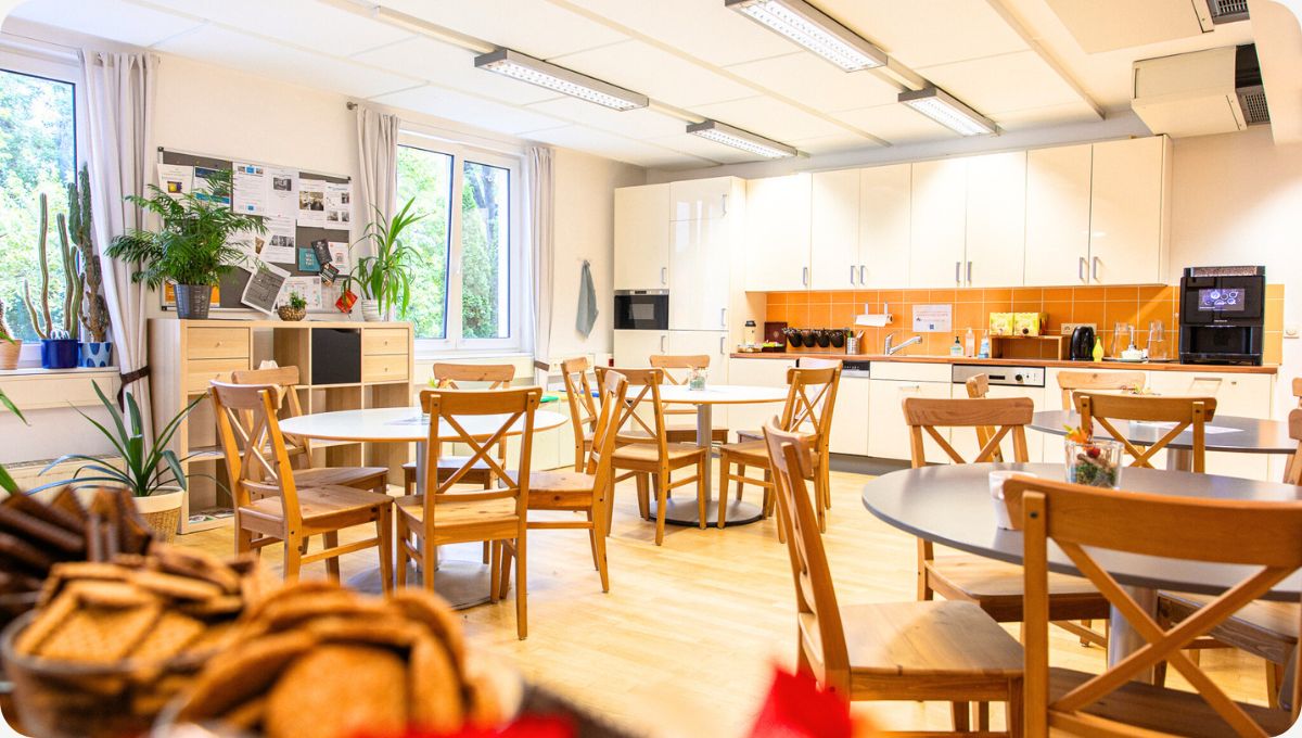 Pausenraum mit Snack-Theke Kühlschrank, Mikrowelle, Kaffee-Vollautomat, Geschirr/Besteck